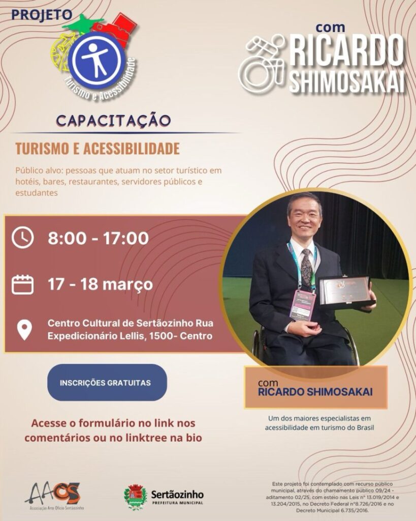 No início do ano, nos dias 17 e 18 de março, o consultor Ricardo Shimosakai realizou um treinamento sobre “A formação em Acessibilidade e Turismo orientando os empresários de hotéis, bares, restaurantes, servidores públicos, profissionais do turismo, colaboradores do turismo e gestores dos atrativos turísticos, apresentando as barreiras e desafios da mobilidade urbana e nos estabelecimentos comerciais.