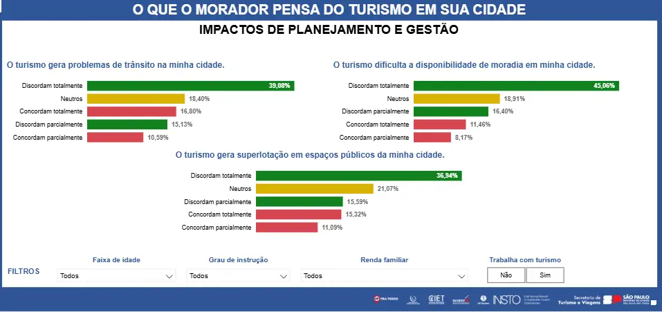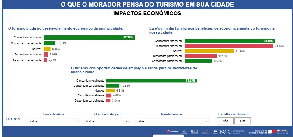 E, 74,26% concordam totalmente que o turismo é bom para as cidades e 71,44% responderam que é bom para a população.